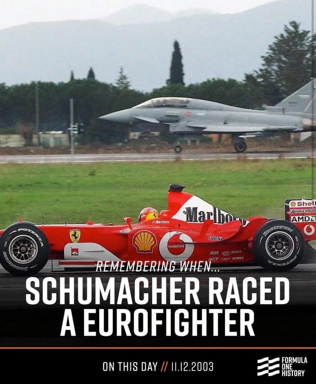 2003 – Michael Schumacher raced against a Eurofighter Typhoon #OnThisDay 11 December, in his Ferrari F2003 at the Baccarini military airport near Rome, Schumacher was attempting to prove he could outpace a jet. The contest spanned three distances—600, 900, and 1200 meters—but Schumacher lost 2-1. With a top speed of 370 kph, the Ferrari was outmatched by the fighter jet's 2450 kph. The jet, stripped of its weapons, weighed 21,000 kilos compared to the Ferrari's mere 600. The event commemorated 100 years of manned flight and the 50th anniversary of Tazio Nuvolari's death. Nuvolari had famously raced his Alfa Romeo 8C2300 against a Caproni 100 biplane in 1931. Reflecting on the race, Schumacher said, "It was a very interesting experience. I was glad to be here today—it was very impressive." #f1 #formula1 submitted by /u/EighteenLevel |